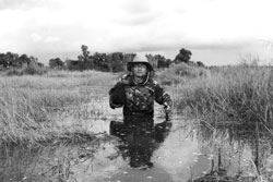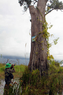 | Phóng viên Phạm Cường trong chuyến tìm hiểu về cây thủy tùng |