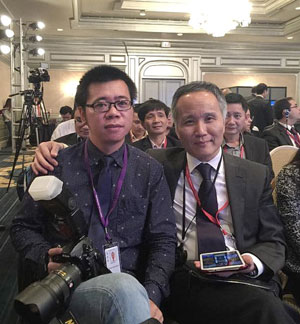 P/V TTXVN Trần Thanh Tuấn (bên trái) và Trưởng đoàn Đàm phán TTP Việt Nam, Thứ trưởng Bộ Công thương Trần Quốc Khánh, tại cuộc họp báo sau Hội nghị Bộ trưởng TPP ở Atlanta |