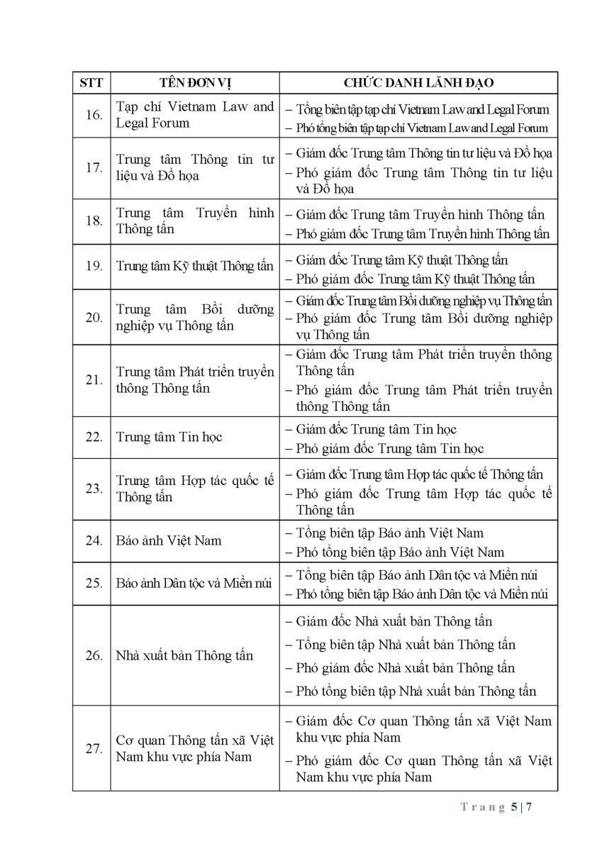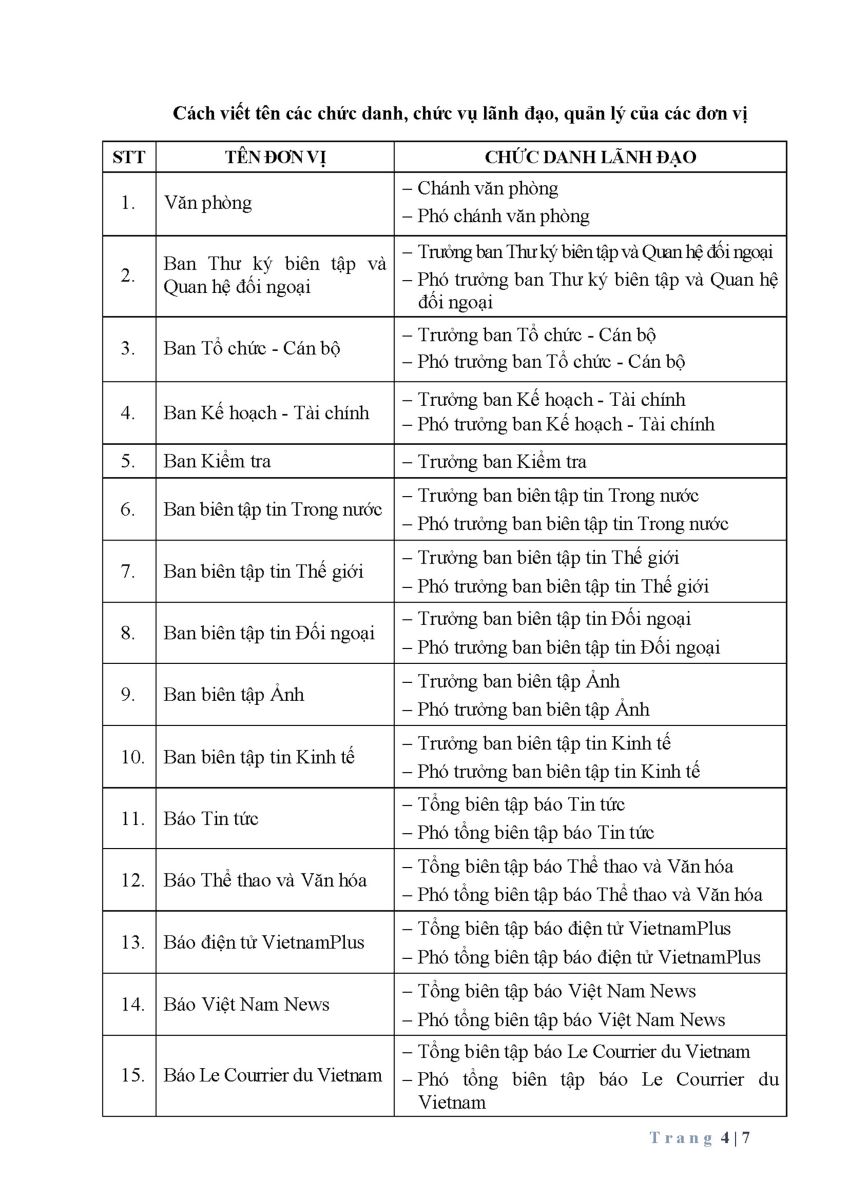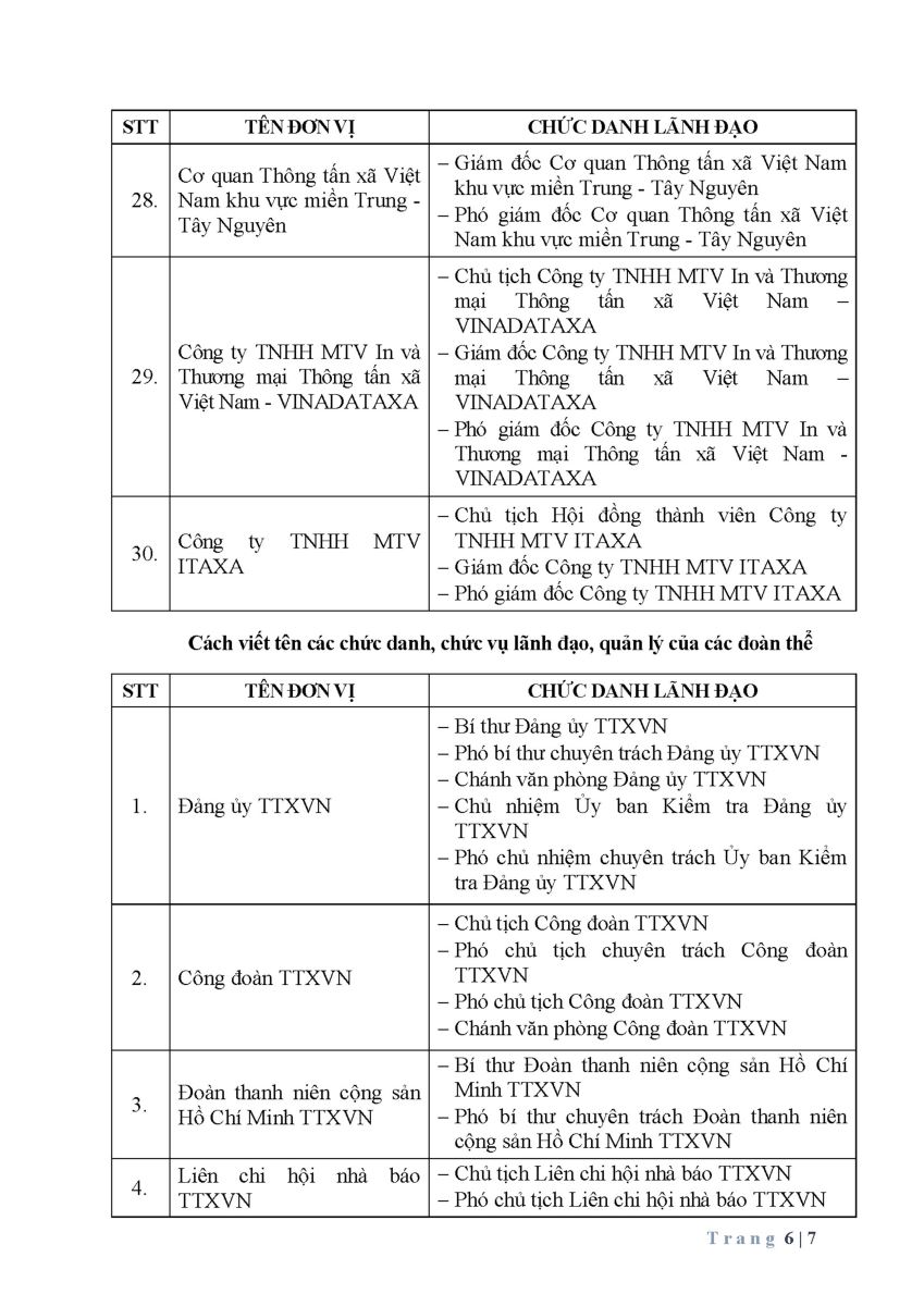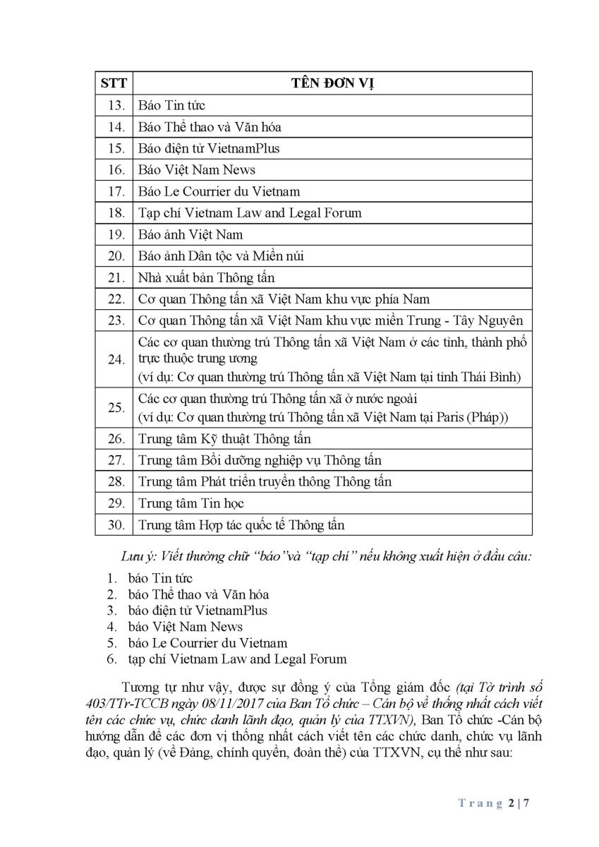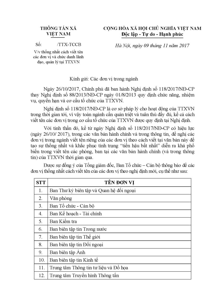Hoạt động nghiệp vụSổ tay phóng viên Cách viết tên các chức danh, chức vụ lãnh đạo, quản lý của các đơn vị, đoàn thể Thứ năm, 03/05/2018 15:15 Ngày 26/10/2017, Chính phủ ban hành Nghị định số 118/2017/NĐ-CP quy định chức năng, nhiệm vụ, quyền hạn và cơ cấu tổ chức của TTXVN (thay thế Nghị định số 88/2013/NĐ-CP ngày 01/8/2013).Để thống nhất trong các văn bản hành chính và thông tin, Nội san Thông tấn xin giới thiệu cùng bạn đọc cách viết tên riêng các đơn vị, cũng như cách viết tên các chức vụ, chức danh lãnh đạo, quản lý (về Đảng, chính quyền, đoàn thể) trong ngành theo văn bản số 405/TTX-TCCB, ngày 09/11/2017 của TTXVN. Theo Nội san thông tấn số 4/2018