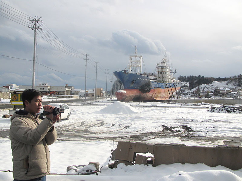 | Phóng viên Đào Thanh Tùng, Cơ quan thường trú Tokyo (Nhật Bản), tác nghiệp tại vùng thảm họa ở tỉnh Iwate, tháng 2/2012 |