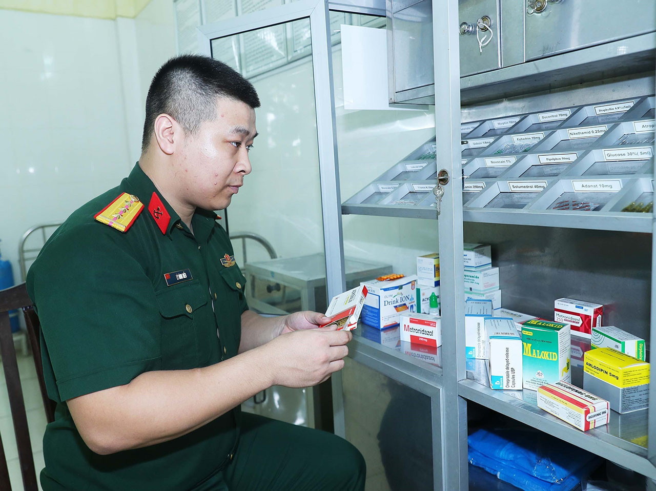 | Thượng úy, thương binh Lý Đình Hiếu, Lữ đoàn Công binh 239 (Bộ Tư lệnh Công binh) sắp xếp lại tủ thuốc của trạm xá, tháng 7/2023 |