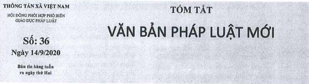 Tin cùng chuyên mục Tóm tắt Văn bản pháp luật mới: Số 35 ngày 07/9/2020 của Hội đồng phối hợp phổ biến, giáo dục pháp luật - TTXVN07/09/2020 14:22 Tóm tắt Văn bản pháp luật mới: Số 34 ngày 31/8/2020 của Hội đồng phối hợp phổ biến, giáo dục pháp luật - TTXVN31/08/2020 09:46 Tóm tắt Văn bản pháp luật mới: Số 33 ngày 24/8/2020 của Hội đồng phối hợp phổ biến, giáo dục pháp luật - TTXVN24/08/2020 10:22 Tóm tắt Văn bản pháp luật mới: Số 32 ngày 17/8/2020 của Hội đồng phối hợp phổ biến, giáo dục pháp luật - TTXVN17/08/2020 09:31 Tóm tắt Văn bản pháp luật mới: Số 31 ngày 10/8/2020 của Hội đồng phối hợp phổ biến, giáo dục pháp luật - TTXVN10/08/2020 09:45 Tóm tắt Văn bản pháp luật mới: Số 30 ngày 03/8/2020 của Hội đồng phối hợp phổ biến, giáo dục pháp luật - TTXVN03/08/2020 10:23