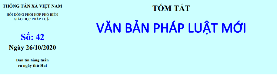 Tin cùng chuyên mục Tóm tắt Văn bản pháp luật mới: Số 41 ngày 19/10/2020 của Hội đồng phối hợp phổ biến, giáo dục pháp luật - TTXVN20/10/2020 10:35 Tóm tắt Văn bản pháp luật mới: Số 40 ngày 12/10/2020 của Hội đồng phối hợp phổ biến, giáo dục pháp luật - TTXVN13/10/2020 10:09 Tóm tắt Văn bản pháp luật mới: Số 39 ngày 05/10/2020 của Hội đồng phối hợp phổ biến, giáo dục pháp luật - TTXVN06/10/2020 09:51 Tóm tắt Văn bản pháp luật mới: Số 38 ngày 28/9/2020 của Hội đồng phối hợp phổ biến, giáo dục pháp luật - TTXVN28/09/2020 10:49 Tóm tắt Văn bản pháp luật mới: Số 37 ngày 21/9/2020 của Hội đồng phối hợp phổ biến, giáo dục pháp luật - TTXVN21/09/2020 10:29 Tóm tắt Văn bản pháp luật mới: Số 36 ngày 14/9/2020 của Hội đồng phối hợp phổ biến, giáo dục pháp luật - TTXVN14/09/2020 11:20