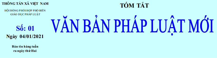 Tin cùng chuyên mục Tóm tắt Văn bản pháp luật mới: Số 51 ngày 28/12/2020 của Hội đồng phối hợp phổ biến, giáo dục pháp luật - TTXVN29/12/2020 10:30 Tóm tắt Văn bản pháp luật mới: Số 50 ngày 21/12/2020 của Hội đồng phối hợp phổ biến, giáo dục pháp luật - TTXVN21/12/2020 14:45 Tóm tắt Văn bản pháp luật mới: Số 49 ngày 14/12/2020 của Hội đồng phối hợp phổ biến, giáo dục pháp luật - TTXVN14/12/2020 14:40 Tóm tắt Văn bản pháp luật mới: Số 48 ngày 07/12/2020 của Hội đồng phối hợp phổ biến, giáo dục pháp luật - TTXVN07/12/2020 10:32 Tóm tắt Văn bản pháp luật mới: Số 47 ngày 30/11/2020 của Hội đồng phối hợp phổ biến, giáo dục pháp luật - TTXVN30/11/2020 15:10 Tóm tắt Văn bản pháp luật mới: Số 46 ngày 23/11/2020 của Hội đồng phối hợp phổ biến, giáo dục pháp luật - TTXVN23/11/2020 09:43