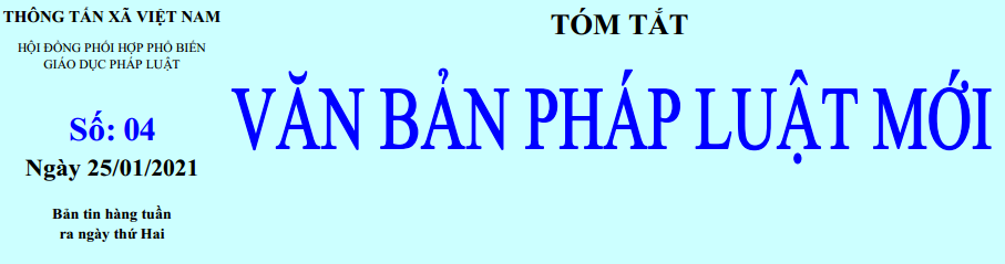 Tin cùng chuyên mục Tóm tắt Văn bản pháp luật mới: Số 03 ngày 18/01/2021 của Hội đồng phối hợp phổ biến, giáo dục pháp luật - TTXVN18/01/2021 14:30 Tóm tắt Văn bản pháp luật mới: Số 02 ngày 11/01/2021 của Hội đồng phối hợp phổ biến, giáo dục pháp luật - TTXVN11/01/2021 11:29 Tóm tắt Văn bản pháp luật mới: Số 01 ngày 04/01/2021 của Hội đồng phối hợp phổ biến, giáo dục pháp luật - TTXVN04/01/2021 15:07 Tóm tắt Văn bản pháp luật mới: Số 51 ngày 28/12/2020 của Hội đồng phối hợp phổ biến, giáo dục pháp luật - TTXVN29/12/2020 10:30 Tóm tắt Văn bản pháp luật mới: Số 50 ngày 21/12/2020 của Hội đồng phối hợp phổ biến, giáo dục pháp luật - TTXVN21/12/2020 14:45 Tóm tắt Văn bản pháp luật mới: Số 49 ngày 14/12/2020 của Hội đồng phối hợp phổ biến, giáo dục pháp luật - TTXVN14/12/2020 14:40