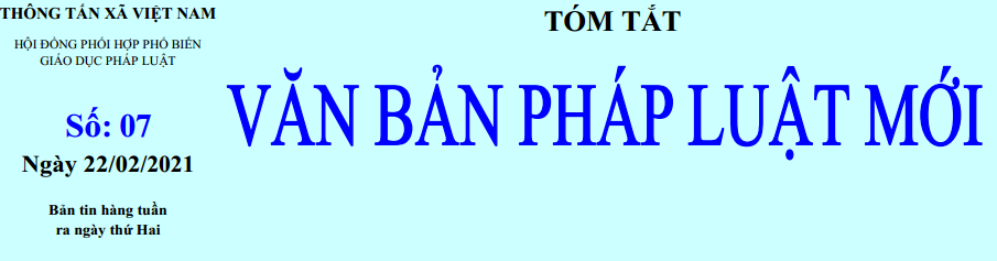 Tin cùng chuyên mục Tóm tắt Văn bản pháp luật mới: Số 06 ngày 08/02/2021 của Hội đồng phối hợp phổ biến, giáo dục pháp luật - TTXVN08/02/2021 11:36 Tóm tắt Văn bản pháp luật mới: Số 05 ngày 01/02/2021 của Hội đồng phối hợp phổ biến, giáo dục pháp luật - TTXVN01/02/2021 14:29 Tóm tắt Văn bản pháp luật mới: Số 04 ngày 25/01/2021 của Hội đồng phối hợp phổ biến, giáo dục pháp luật - TTXVN25/01/2021 10:06 Tóm tắt Văn bản pháp luật mới: Số 03 ngày 18/01/2021 của Hội đồng phối hợp phổ biến, giáo dục pháp luật - TTXVN18/01/2021 14:30 Tóm tắt Văn bản pháp luật mới: Số 02 ngày 11/01/2021 của Hội đồng phối hợp phổ biến, giáo dục pháp luật - TTXVN11/01/2021 11:29 Tóm tắt Văn bản pháp luật mới: Số 01 ngày 04/01/2021 của Hội đồng phối hợp phổ biến, giáo dục pháp luật - TTXVN04/01/2021 15:07