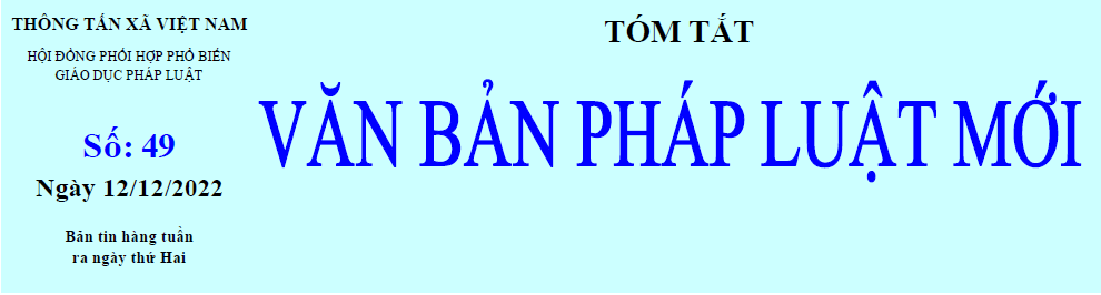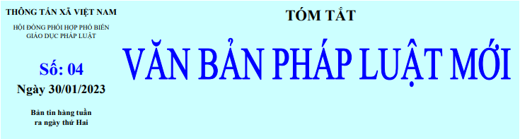 Tin cùng chuyên mục Tóm tắt Văn bản pháp luật mới: Số 03 ngày 16/01/2023 của Hội đồng phối hợp phổ biến, giáo dục pháp luật - TTXVN16/01/2023 15:27 Tóm tắt Văn bản pháp luật mới: Số 02 ngày 09/01/2023 của Hội đồng phối hợp phổ biến, giáo dục pháp luật - TTXVN09/01/2023 16:08 Tóm tắt Văn bản pháp luật mới: Số 01 ngày 03/01/2023 của Hội đồng phối hợp phổ biến, giáo dục pháp luật - TTXVN03/01/2023 09:46 Tóm tắt Văn bản pháp luật mới: Số 51 ngày 26/12/2022 của Hội đồng phối hợp phổ biến, giáo dục pháp luật - TTXVN28/12/2022 09:09 Tóm tắt Văn bản pháp luật mới: Số 50 ngày 19/12/2022 của Hội đồng phối hợp phổ biến, giáo dục pháp luật - TTXVN22/12/2022 09:04 Tóm tắt Văn bản pháp luật mới: Số 49 ngày 12/12/2022 của Hội đồng phối hợp phổ biến, giáo dục pháp luật - TTXVN14/12/2022 08:58