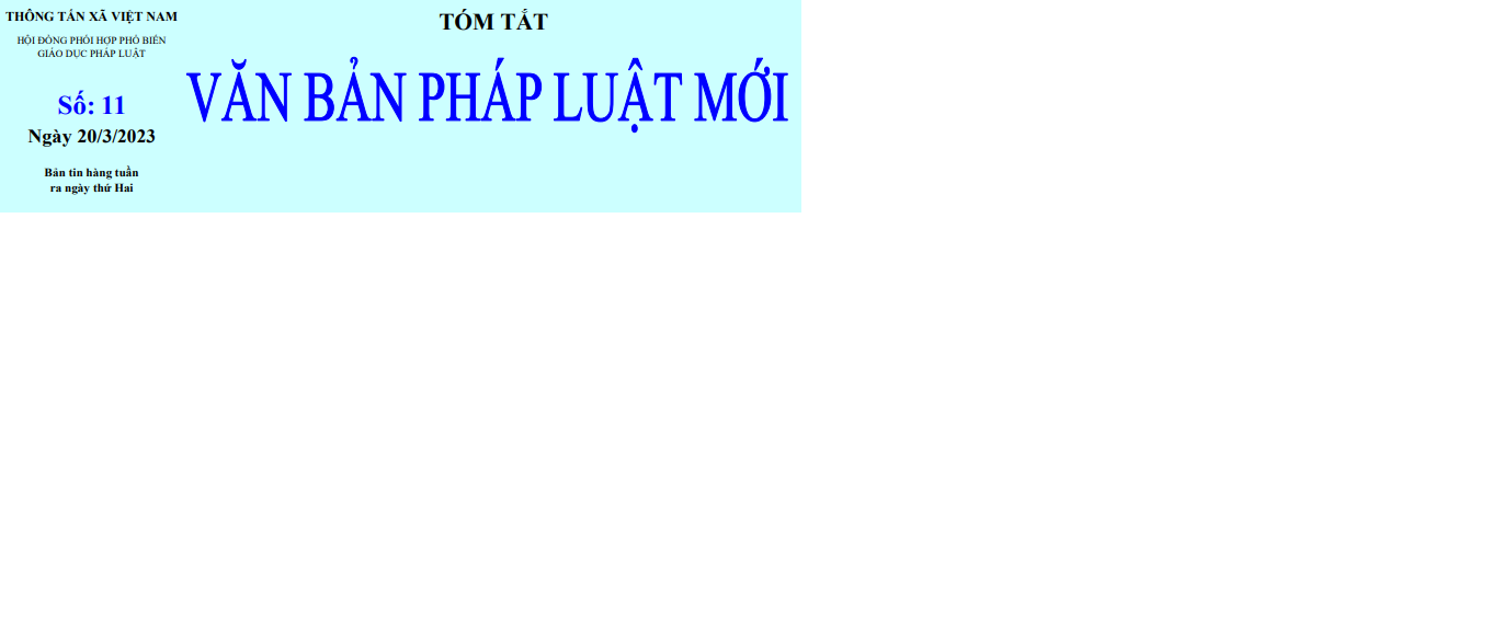 Tin cùng chuyên mục Tóm tắt Văn bản pháp luật mới: Số 10 ngày 13/3/2023 của Hội đồng phối hợp phổ biến, giáo dục pháp luật - TTXVN14/03/2023 14:13 Tóm tắt Văn bản pháp luật mới: Số 09 ngày 06/3/2023 của Hội đồng phối hợp phổ biến, giáo dục pháp luật - TTXVN06/03/2023 16:48 Tóm tắt Văn bản pháp luật mới: Số 08 ngày 28/02/2023 của Hội đồng phối hợp phổ biến, giáo dục pháp luật - TTXVN06/03/2023 16:46 Tóm tắt Văn bản pháp luật mới: Số 07 ngày 20/02/2023 của Hội đồng phối hợp phổ biến, giáo dục pháp luật - TTXVN22/02/2023 09:14 Tóm tắt Văn bản pháp luật mới: Số 06 ngày 13/02/2023 của Hội đồng phối hợp phổ biến, giáo dục pháp luật - TTXVN14/02/2023 15:42 Tóm tắt Văn bản pháp luật mới: Số 05 ngày 07/02/2023 của Hội đồng phối hợp phổ biến, giáo dục pháp luật - TTXVN07/02/2023 09:07