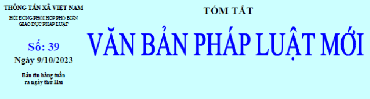 Tin cùng chuyên mục Tóm tắt Văn bản pháp luật mới: số 44 ngày 13/11/2023 của Hội đồng phối hợp Phổ biến giáo dục pháp luật TTXVN15/11/2023 14:56 Tóm tắt Văn bản pháp luật mới: số 43 ngày 06/11/2023 của Hội đồng phối hợp Phổ biến giáo dục pháp luật TTXVN07/11/2023 13:36 Tóm tắt Văn bản pháp luật mới: số 42 ngày 30/10/2023 của Hội đồng phối hợp Phổ biến giáo dục pháp luật TTXVN07/11/2023 13:28 Tóm tắt Văn bản pháp luật mới: số 41 ngày 23/10/2023 của Hội đồng phối hợp Phổ biến giáo dục pháp luật TTXVN24/10/2023 08:45 Tóm tắt Văn bản pháp luật mới: số 40 ngày 16/10/2023 của Hội đồng phối hợp Phổ biến giáo dục pháp luật TTXVN23/10/2023 10:19 Tóm tắt Văn bản pháp luật mới: số 39 ngày 09/10/2023 của Hội đồng phối hợp Phổ biến giáo dục pháp luật TTXVN16/10/2023 08:23