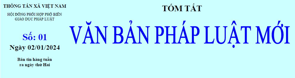 Tin cùng chuyên mục Tóm tắt Văn bản pháp luật mới: số 06 ngày 05/02/2024 của Hội đồng phối hợp Phổ biến giáo dục pháp luật TTXVN14/02/2024 10:33 Tóm tắt Văn bản pháp luật mới: số 05 ngày 29/01/2024 của Hội đồng phối hợp Phổ biến giáo dục pháp luật TTXVN14/02/2024 10:33 Tóm tắt Văn bản pháp luật mới: số 04 ngày 22/01/2024 của Hội đồng phối hợp Phổ biến giáo dục pháp luật TTXVN14/02/2024 10:33 Tóm tắt Văn bản pháp luật mới: số 03 ngày 15/01/2024 của Hội đồng phối hợp Phổ biến giáo dục pháp luật TTXVN14/02/2024 10:33 Tóm tắt Văn bản pháp luật mới: số 02 ngày 08/01/2024 của Hội đồng phối hợp Phổ biến giáo dục pháp luật TTXVN11/01/2024 09:45 Tóm tắt Văn bản pháp luật mới: số 01 ngày 02/01/2024 của Hội đồng phối hợp Phổ biến giáo dục pháp luật TTXVN04/01/2024 08:47